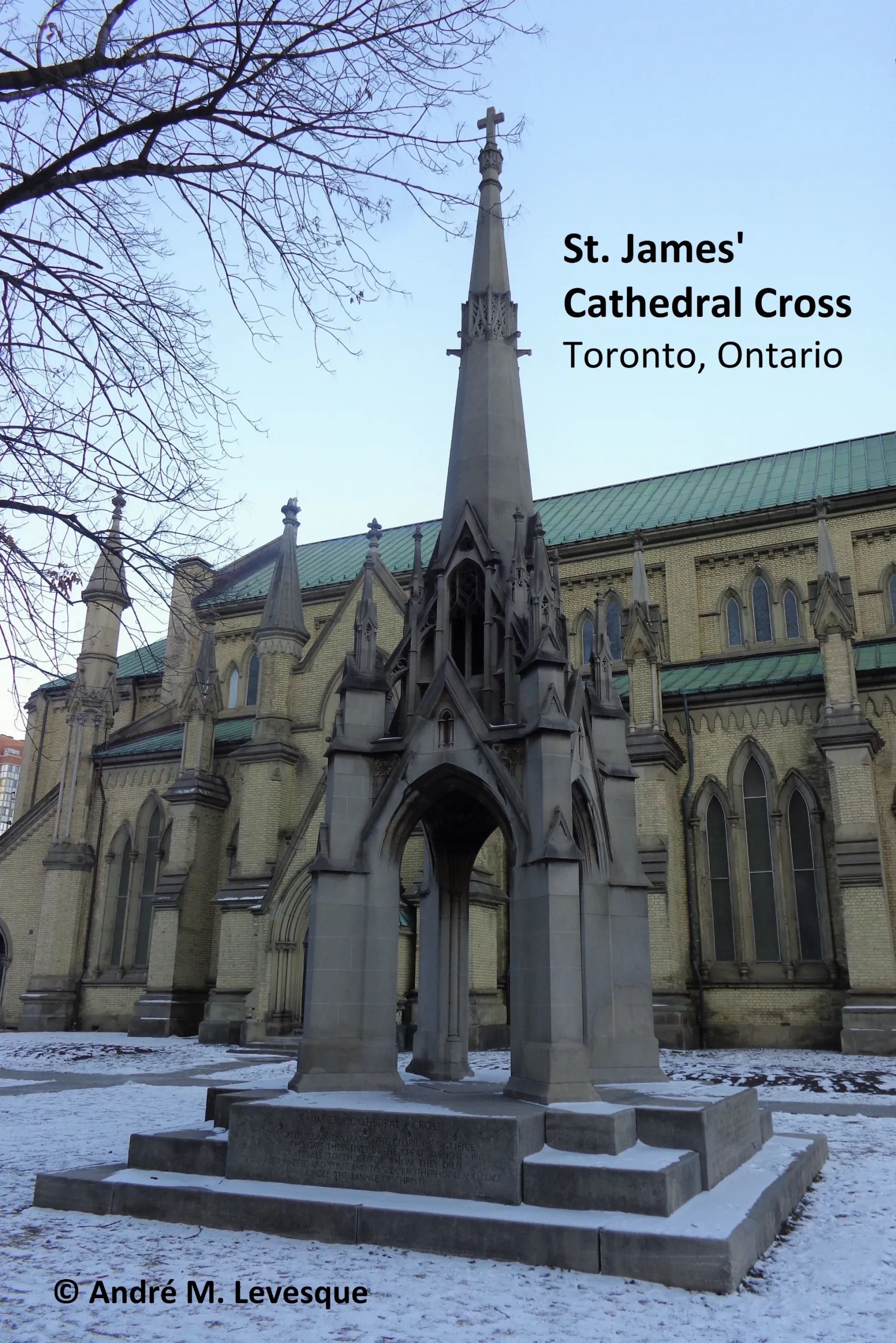 As illustrated in the photograph, the Cathedral Church of St. James (Anglican), located in downtown Toronto, Ontario, had commissioned Henry Sproatt (14 June 1866 – 4 October 1934) to erect a war memorial in the park surrounding the Cathedral. Sproatt trained in Europe and in New York, and in 1899 formed Sproatt & Rolph – a partnership with Ernest Ross Rolph (21 January 1871 – 4 May 1958) in which they successfully collaborated on some of the most renowned landmarks of Canadian architecture for a period of 34 years, including this distinctive shrine of remembrance. Named by Sproatt, its architect, as the 'St. James' Cathedral Cross', this "preaching cross" was erected just in time for the Cathedral's 1924 Remembrance Day services in memory of the parishioners who died during the First World War. Instead of using the popular 'Cross of Sacrifice' that was designed in 1917 by Reginald Blomfield – one of the principal architects of the Imperial War Graves Commission – Sproatt favoured the Cathedral's existing Gothic Revival style of architecture to be applied to the war memorial. The Cathedral Cross consists of a four sided arch featuring a centre steeple with a cross finial at the top and on the façades of its base is inscribed the 48 names of the men from the Cathedral's Roll of Honours as well as a general tribute in their honour: "THIS CROSS COMMEMORATES THE GLORIOUS SACRIFICE OF THOSE WHO GAVE THEIR LIVES IN THE GREAT WAR 1914 - 1918 AND APPEALS TO THOSE FOR WHOM THEY DIED TO LAY ASIDE HATRED AND STRIFE AND TO SEEK BROTHERHOOD AND PEACE UNDER THE BANNER OF CHRIST." Traditional Remembrance observances continue to be held at St. James’ Cathedral, including military representation at the service that feature prayers and readings that reflect on the themes of peace and honouring the dead, the ringing of the bells (half-muffled), the laying of wreaths at the Cathedral Cross and a March Past that takes place following the service.