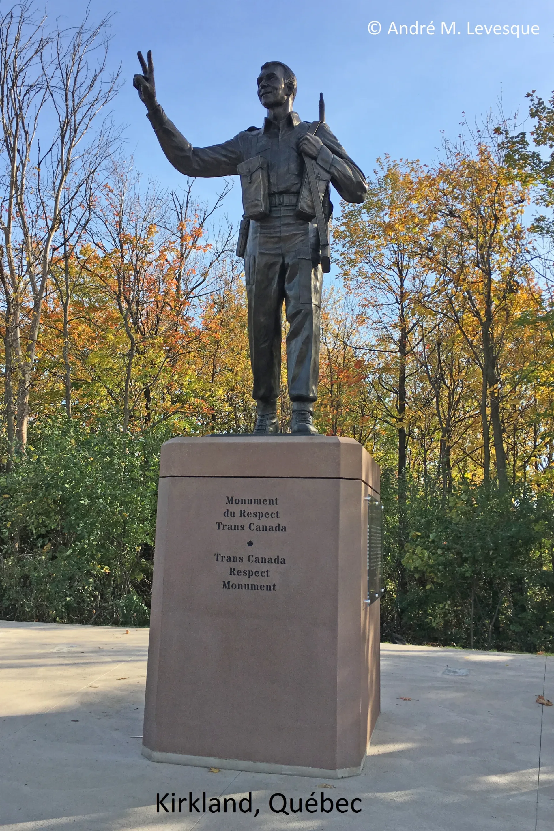 The "Trans Canada Respect Monument" which includes a sculpture called "The Return" was unveiled on 21 October 2017 by the 'Respect Campaign' marking the 150th anniversary of Canadian Confederation, the 375th anniversary of the founding of Montréal and the 100th anniversary of the Battle of Vimy Ridge. Designed and sculpted by the internationally known Canadian artist Colonel (Retired) André D. Gauthier, OMM, CD (1935-26 October 2017), the bronze statue depicts a Second World War veteran "who has come home from war with his arm extended offering a victory/peace sign. He has returned. He stands to remind us that for many who come home there is no victory. They have not found peace. They remain in the conflict where they were serving. They have not returned home. They should not be left behind." As written on the granite pedestal, "this monument honours the service of our men and woman of the Canadian Armed Forces, past, present and future. We honour those who made the ultimate sacrifice serving Canada, those who have been injured and the families whose lives have been forever changed. The monument stands for the respect of those who continue to suffer long after the conflict is over and their duty is done. It serves as witness and as a reminder of our veterans who suffer from PTSD and those homeless on our streets. We honour the sacrifices of those who's pain and suffering has made them a casualty of suicide."