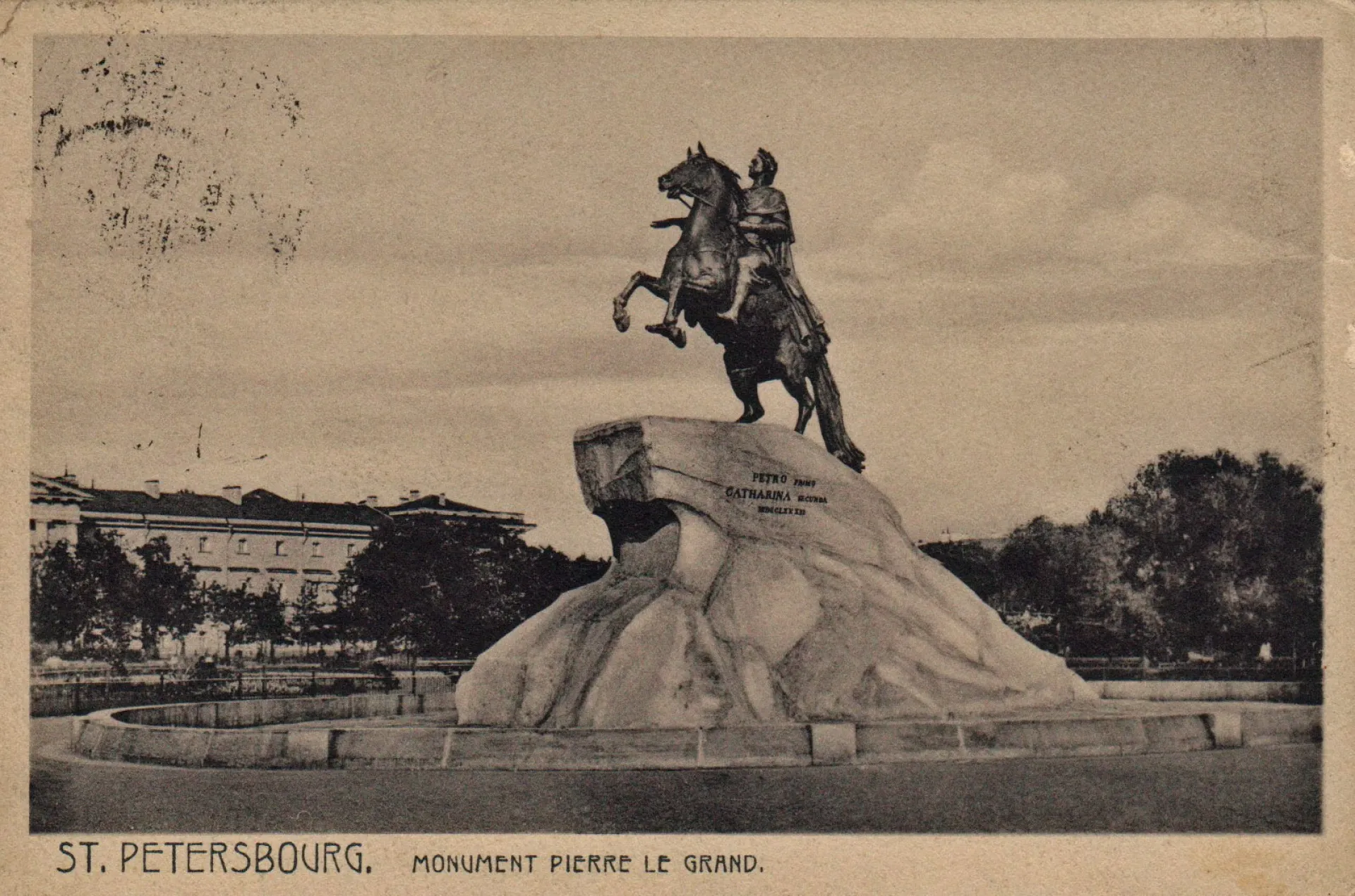 In 1764, Catherine commissioned the famous French sculptor Etienne Maurice Falconet (1716 – 1791) to complete this masterpiece. Catherine "wanted a monument that would impress with the scale of Peter the Great's vision and at the same time bear the stamp of her efforts to further that vision." Falconet's original design was to make the horse in the pose bondissante and to place it at the elevated end of a natural stone runway. Instead, a large monolith was used as a plinth for the sculpture. Finally, after twelve years of labour, the sculpture was inaugurated with great pomp and circumstance by the Empress on 7 August 1782 – the centennial anniversary of Tsar Peter's coronation. This was an historic event as it was the "dedication of the first monument ever to be erected in Russia and a joint tribute to the only monarchs in modern Russian history who were deemed worthy of the epithet 'Great.'" In addition to the superb bronze statue and the impressive pedestal cliff, this sculpture arguably also includes "the most ingenious monument inscription ever designed." A sublime coda was written in bronze lettering across the faces of the pedestal: "To Peter the First, Catherine the Second, 1782" – with Latin facing the west and Russian facing the east. By engaging the local population, its nation, and Europe at that time, in developing, constructing, and celebrating what is considered Russia's first modern national memorial – Catherine achieved not only the just tribute to her famous predecessor but also her memorialization that she mutely desired. Depicted is a post card dated 1 November 1909 from Saint Petersburg to Madame J. Charles in Paris illustrating the "Bronze Horseman" monument to Peter the Great.