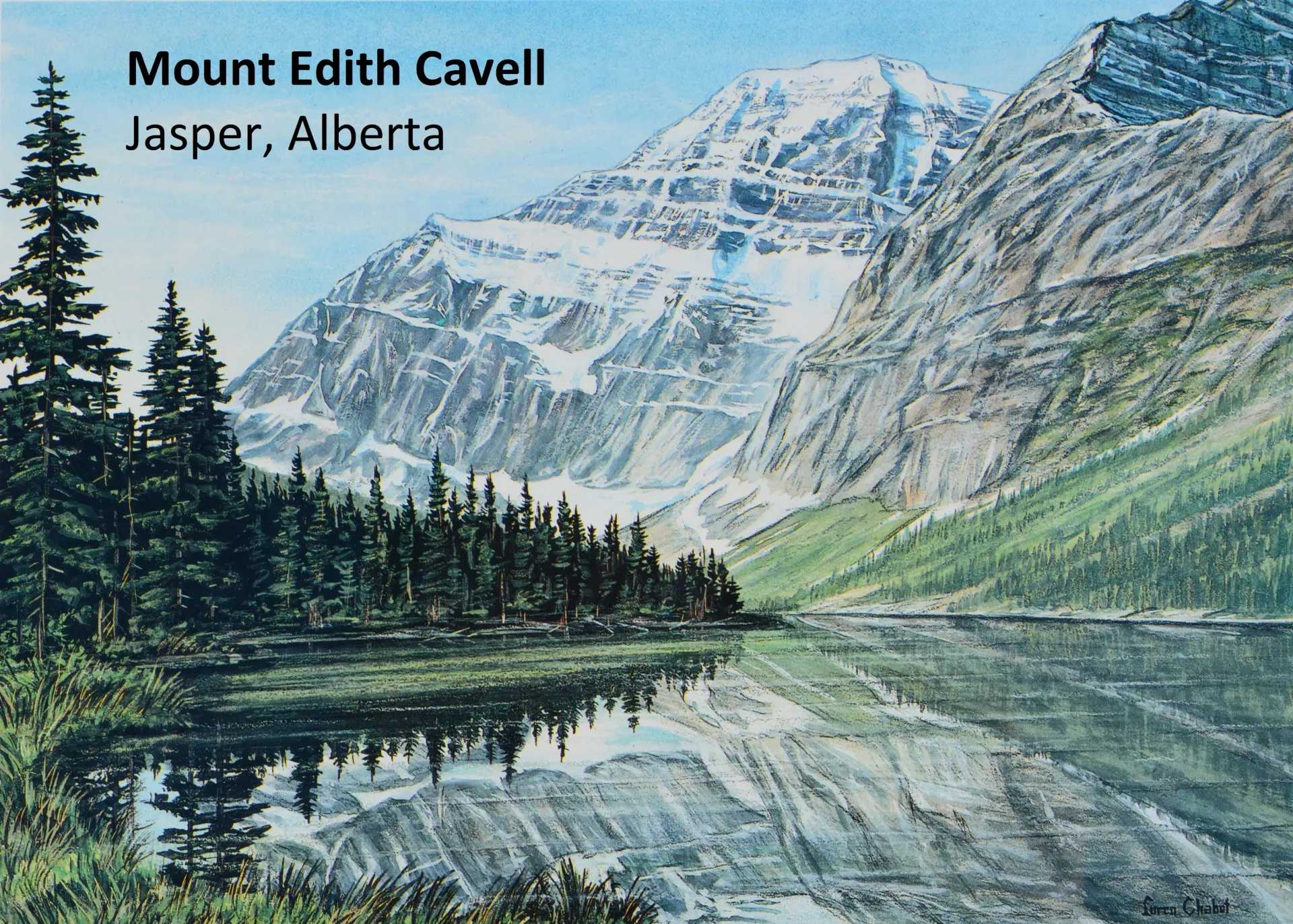 While there have been many memorials erected in her honour throughout Europe, Canada was of one of the first countries to commemorate her. It was on 4 July 1916 that the Geographic Board of Canada officially designated 'Mount Edith Cavell' in her honour. This mountain feature is located in the Athabascan River and Astoria River valleys of Jasper National Park and is the most prominent peak (about 3,363 m) within the province of Alberta. Shown in the lithograph print is a scene painted by Canadian artist Loren Chabot (1954 - 2010) of the Northeast face of Mount Edith Cavell.