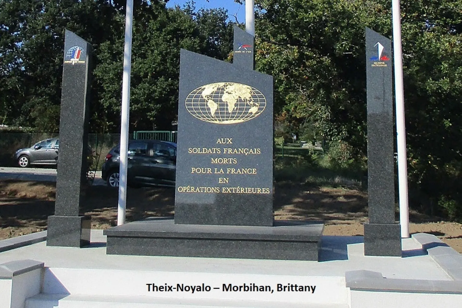 Pending the inauguration of the national monument that was scheduled for 11 November 2019, a local monument – designed by Jean-Claude Champion of Elven – had been erected in Morbihan to honour these soldiers. It was inaugurated on Saturday, 9 March 2019 in the city of Theix-Noyalo (Morbihan, Brittany). The monument was created, financed and conceived by the Association nationale des Titulaires du Titre de Reconnaissance de la Nation (ANT-TRN) and received active support from the city's elected officials. Created in 1996 by Alain Couperie, its founding president, one of its goals was to perpetuate the remembrance of French soldiers "de la 4ème génération du feu" who died in external operations after the Algerian War (1954-1962). As shown in the photograph, the black marble monument, more than two metres high, bears the inscription "AUX SOLDATS FRANÇAIS MORTS POUR LA FRANCE EN OPÉRATIONS EXTÉRIEURES", under a stylized planisphere. Surrounding the central stele are three pillars with images representing the three services of their armed forces (from left to right): "l'armée de Terre, l'armée de l’Air, la Marine nationale." With a total cost of €23,000, it was financed exclusively by the association. The monument was erected on land donated by the municipality of Theix-Noyalo, near the town's war memorial dedicated to the First and Second World Wars. While not planned as such but inspired by General Thorette's vision, the city of Theix-Noyalo has the unique privilege of having the first commemorative monument in France to be erected in honour of French soldiers who died while serving in external operations in the context of international mandates.