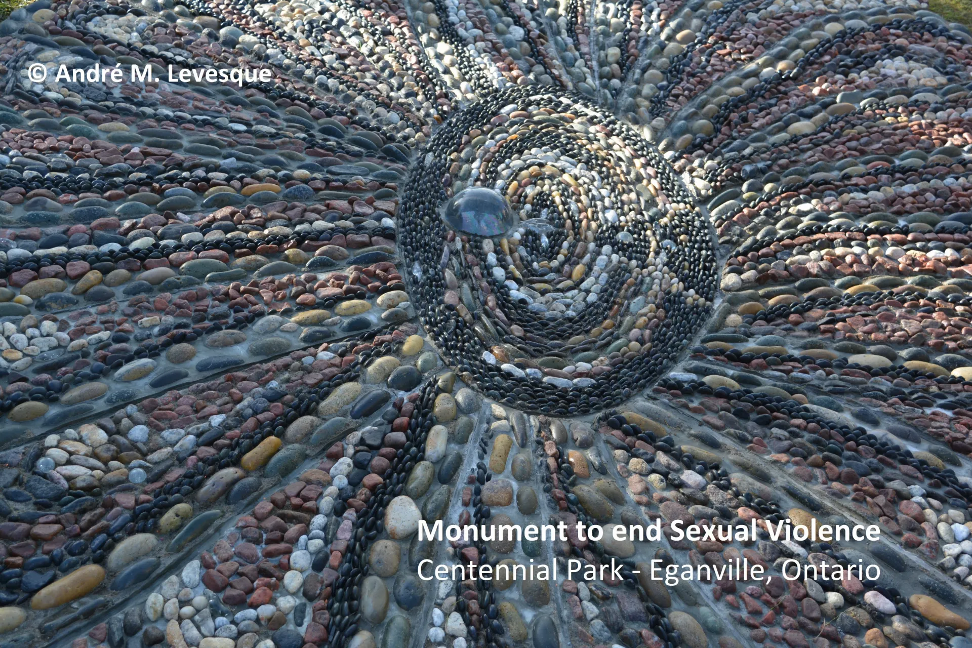 The concept was to produce a large or 'anchor' monument in Eganville with its 'sister' monuments to be located on the three other sites. Members of the community were invited to help build the four mosaic public artworks that consisted of 29 components for the main monument and three others for the sister monuments. After sorting five tons of stone for the monuments, the components were built on tables one pebble at a time and after completion of the pouring and curing process, they were released from their molds. Within First Nations cultures stones are called 'grandfathers' and are living with spirits. Stones and rocks are wise and sacred because of everything they have seen and experienced. Rocks have spirits that guide and assist us. It is befitting that the first-ever monument in Canada dedicated to survivors of sexual violence is made of stone. While the Pembroke sister monument was unveiled on 14 October 2016, the remainder of the monuments were unveiled separately the following day. Project funding was provided by the Government of Ontario. Depicted in the photograph are details from the principal monument of the Countdown Public Art Project.
