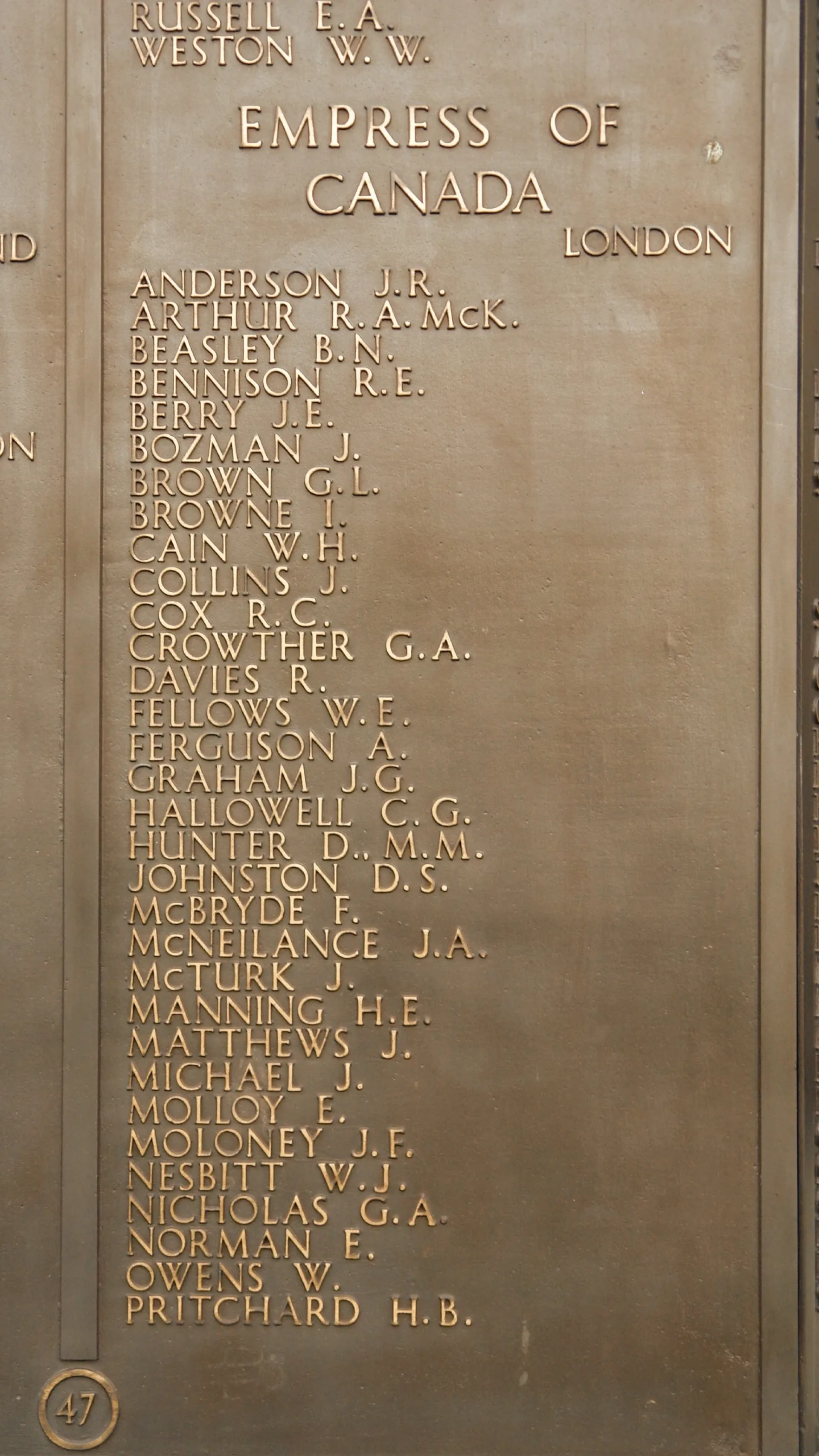 It is worth noting that part of panel 47 of the Memorial makes reference to the SS Empress of Canada, a Canadian merchant vessel, which was sunk during the Second World War and its crew of 32 is commemorated as they have no known grave.