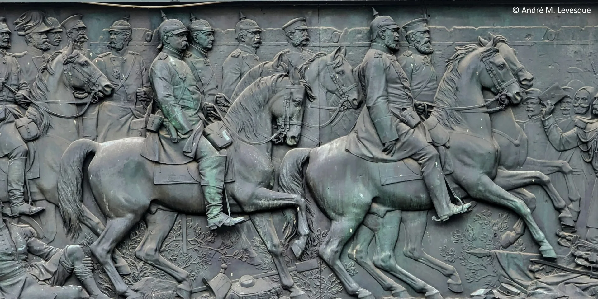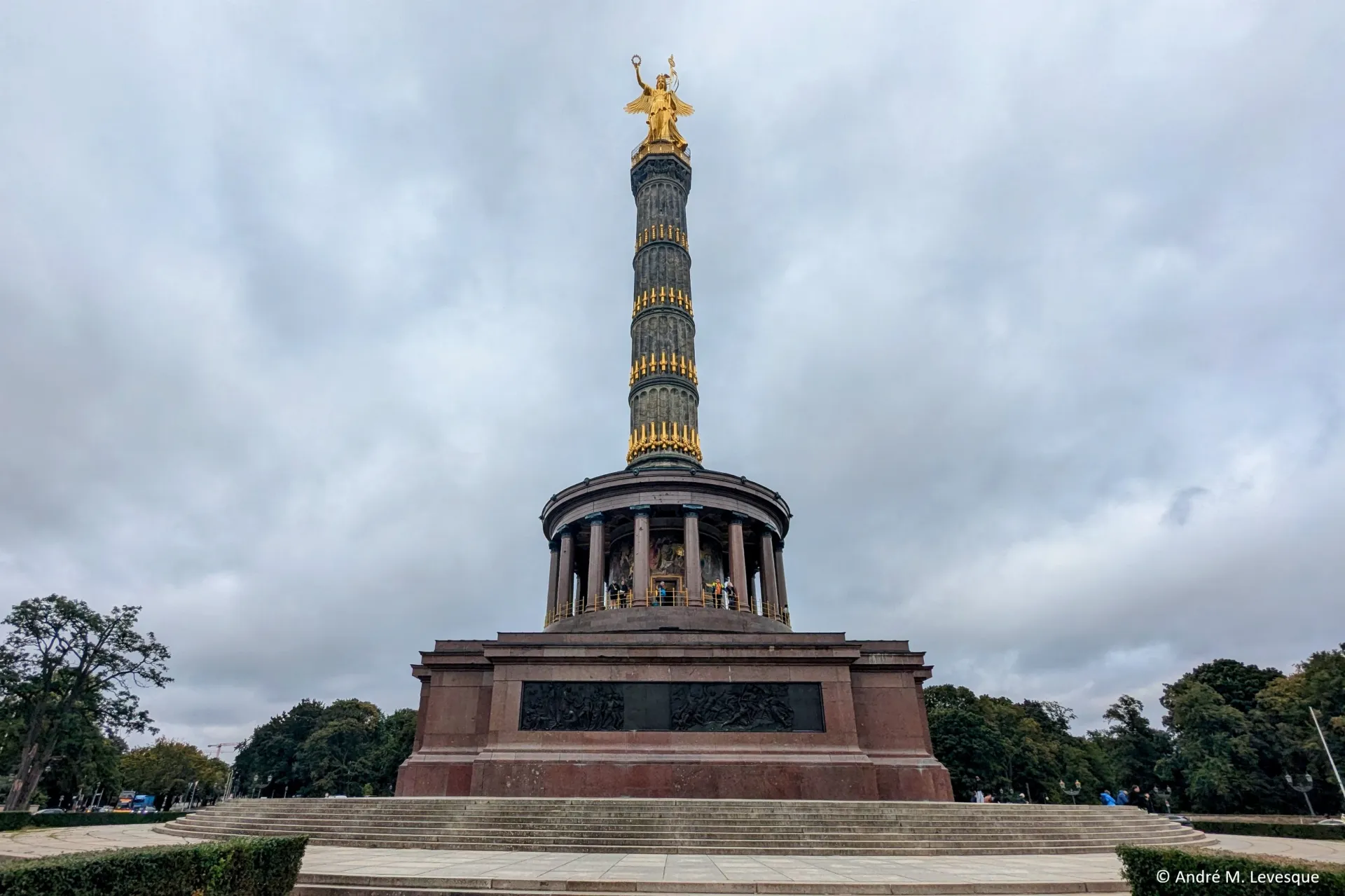 Four frieze relief panels, made from the metal of melted down captured cannons, are set into the architrave block of red granite. They depict the three wars of 1864, 1866 and 1870, as well as the triumphal procession into Berlin on 16 June 1871. Following the Second World War, the French occupying forces dismantled three of the four bronze relief panels depicting scenes of German victories from the pedestal in May 1945 and removed them to Paris. The French considered the Siegessäule an eye-sore as they wanted to prevent the reminders of past defeats, particularly the Franco-Prussian War. Several sections of the reliefs were damaged during the war and their removal by the French, and remain in France. Thanks to an initiative by then-French President François Mitterrand, the three bronze relief panels were returned to Germany as a gesture of reconciliation between the nations for the city's 750th anniversary in 1987. The restored reliefs were ceremonially returned from Paris and were reattached to the monument deliberately left in a fragmented state. In the photograph is part of the east wall panel which depicts the surrender of France’s capitulation documents to Wilhelm I, and the German troops marching into Paris. Above the pedestal and reliefs, a circular mosaic of glass fragments is set onto a circular hall, reminiscent of a temple. Visitors can climb the 285 steps to a viewing platform offering breathtaking views of Tiergarten and the city of Berlin.