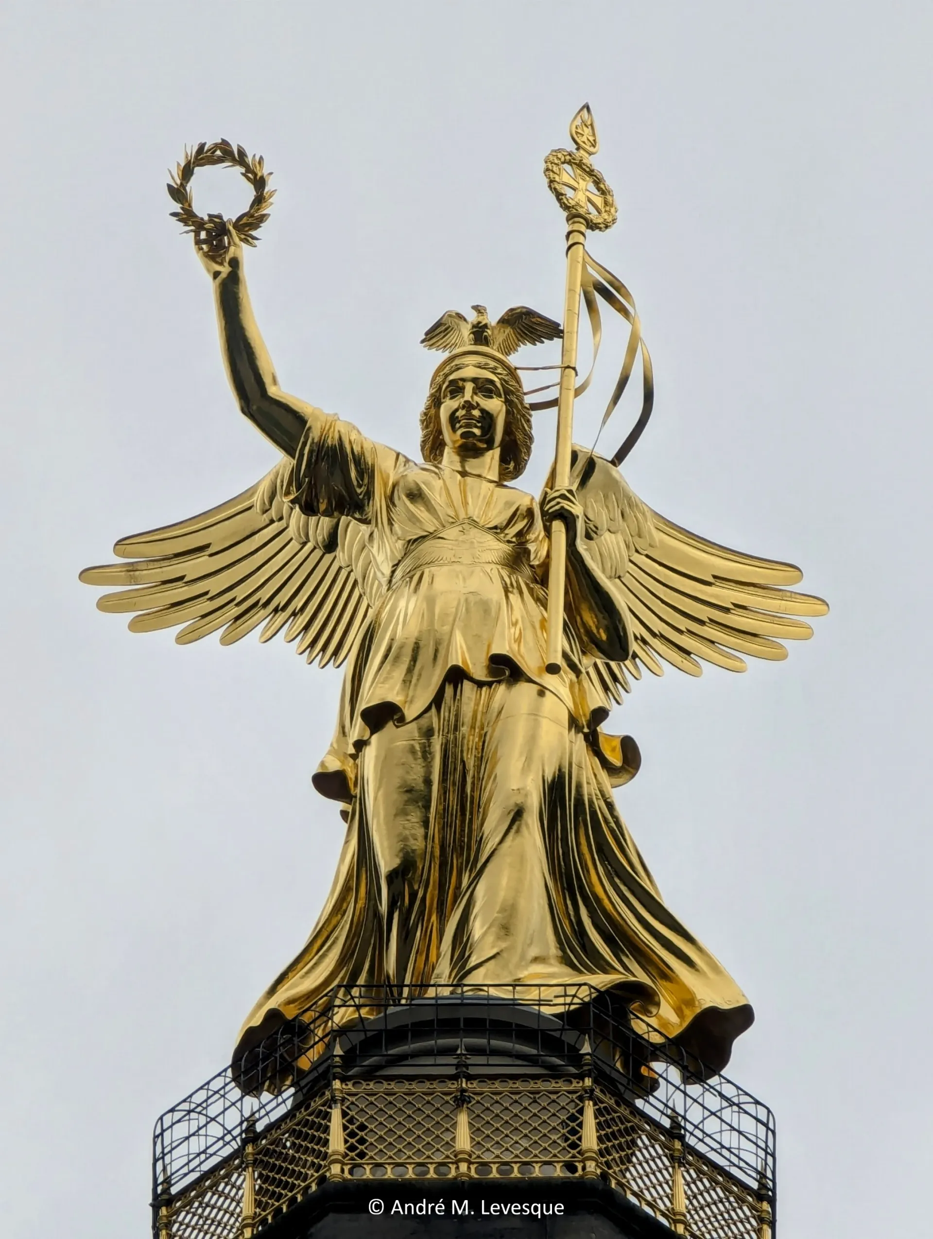 The column was designed by German architect Johann Heinrich Strack (6 July 1805 – 13 June 1880), who had been working on its sketches since 1864. The column proper, made of sandstone is finished off with a frieze of eagles. The first three segments of the column are adorned with 60 gold-painted guns captured from Denmark, Austria, and France after the wars of German unification. The monument is crowned with an 8.3-meter (27-foot) tall, 35-ton bronze sculpture of Victoria, the Roman goddess of victory – a symbol of military triumph. The statue is often called ‘Goldelse’ (Golden Elsie) or ‘Golden Lizzy’ by Berliners.