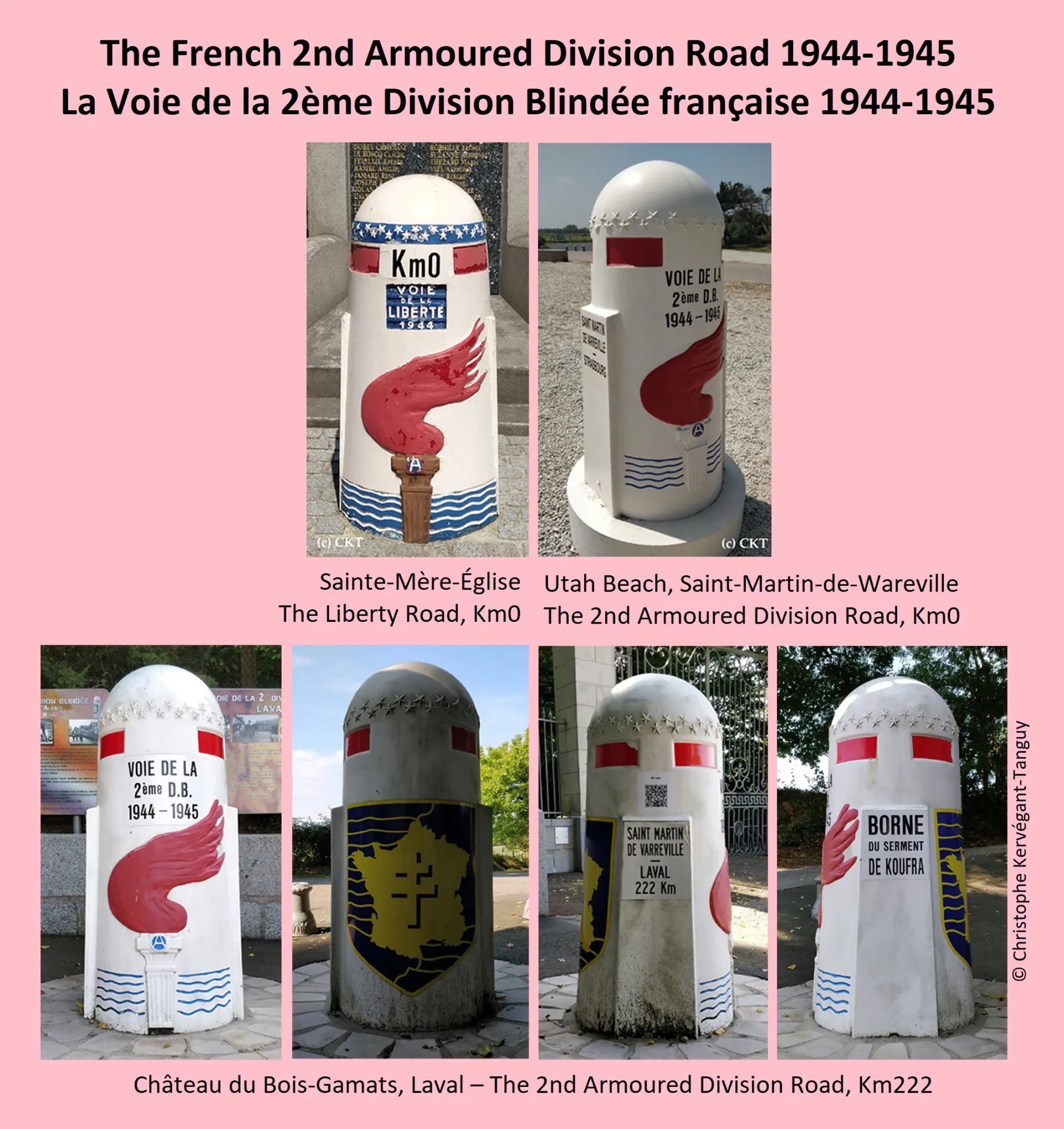 Today, a distinctive marker placed at the entrance of Bois-Gamats castle commemorates this episode, and in particular, the 2ème D.B. This tribute was inaugurated on 9 September 2015 in the presence of Helen Patton (1962- ), the general's granddaughter. It is one of the many stone markers or "Bornes" that form the '2nd Armoured Division Road' (la "Voie de la 2ème D.B.") modelled on the 'Liberty Road' (la "Voie de la Liberté"). The latter was conceived in June 1944 by Colonel Guy de La Vasselais (1902-1976), former head of the French military tactical liaison mission to the Third U.S. Army, and Gabriel Hocquard (1892-1974), the mayor of Metz. Installed as a monument to manifest an "everlasting symbol of Liberty" and to commemorate the liberation of Western Europe, milestones or Bornes mark the route (1,145 kilometres long) followed by the American First and Third Armies and the French 2ème D.B. during the Battle of Normandy. Accordingly, there are 1,146 of such markers that runs across France, Luxembourg and Belgium – from Utah Beach to Bastogne in Belgium. French sculptor François Cogné (1876-1952) designed the 1m20 (48 inches) high model marker that were to be pink! They all share a similar facing side: a red flaming torch of the Statue of Liberty – as a symbol of freedom, emerging from the waves of the Atlantic Ocean that the Allies crossed to liberate Europe. Circling the top portion of the Borne are the 48 stars of the American Flag that existed at the time. However, different depictions can be found around them. As shown in the top left of the photo mosaic, the first milestone or "Km 0" of the Liberty Road is located at the Sainte-Mère-Église and was inaugurated on 17 September 1947. The marker next to it is the "Km 0" of the 2nd Armoured Division Road that copies the same design but with the inscription "Voie de la 2ème D.B. 1944-1945" that was inaugurated on 25 July 2004. The four photos shown in the second row illustrate the 2nd Armoured Division Road marker located at Bois-Gamats where it mentions two dedications: from "Saint-Martin-de-Warreville" to "Laval 222 Km", the starting point at Utah Beach of the "Voie de la 2ème D.B.", and "Borne du serment de Koufra", a pledge made on 2 March 1941 by Major Leclerc and his Free France comrades in Fort El Tag in Koufra: "We will not lay down our arms till the Colours, the beautiful Colors [French flag], fly from the steeple of the Strasbourg Cathedral." The back side features the badge of the 2ème D.B. with the Cross of Lorraine.