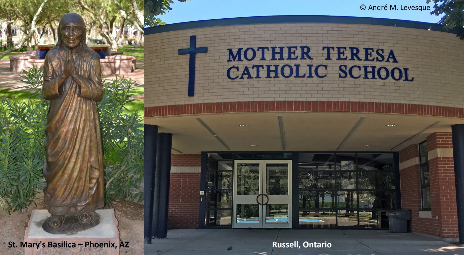Shown in the photograph is a statue erected in honour of Saint Teresa of Calcutta located within the garden of St. Mary's Basilica in Phoenix, Arizona. There are also many Roman Catholic schools that have been named in her honour, including St. Teresa School in the Village of Russell, Ontario. Opened in September 2002, this elementary school serves the eastern region of Ontario and draws students from both rural and urban settings.
