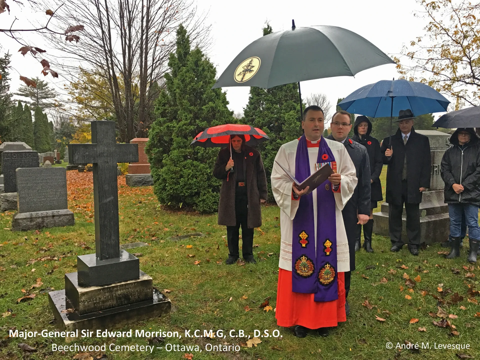 Following the presentation was an unveiling of Morrison's newly restored monument. As shown in the photograph, Brigadier-General (now Major-General) Guy Chapdelaine, O.M.M., C.D., Q.H.C., Chaplain General of the Canadian Armed Forces gave the invocation at the ceremony in the presence of Morrison's family members, friends and the military community. Behind him holding a poppy umbrella is Susan Raby-Dunne who led this restoration project in partnership with Beechwood Cemetery and The Royal Regiment of Canadian Artillery. At Morrison's grave site, the Chaplain General paid tribute by saying: “We remember today all those who served in the First World War and in particular the Canadian Corps in Passchendaele one hundred years ago. We give thanks for their tremendous perseverance in the face of the misery they faced every day: the mud, vermin, lice, disease, and the inescapable stench of death; not to mention the constant noise, the barrage of artillery fire, and the ever present threat of a gas attack. We remember the man honoured by this gravestone - Major General Edward Morrison, General Officer Commanding the Artillery, later named Knight Commander of the Order of St Michael and St George. We echo his praise for those under his command; for the herculean task they accomplished together. As he, himself wrote, “But – oh! What a tale for the generations to come. Never in civilian life are men called upon to labour as those men laboured – with all the might of their bodies, to lift, and carry, and pull, for the sake of their comrades and their cause.” May we never forget their sacrifice, but remember always that “for every inch of ground gained,” Canada’s sons paid “a price more terrible than the human tongue can tell.” We grieve the loss of so many lives during that battle, and the devastation that was wrought on all sides of this horrible conflict. We remember the families who waited at home for word of their loved ones, only to receive silence in return, or the awful word that their loved ones would never come home.”
