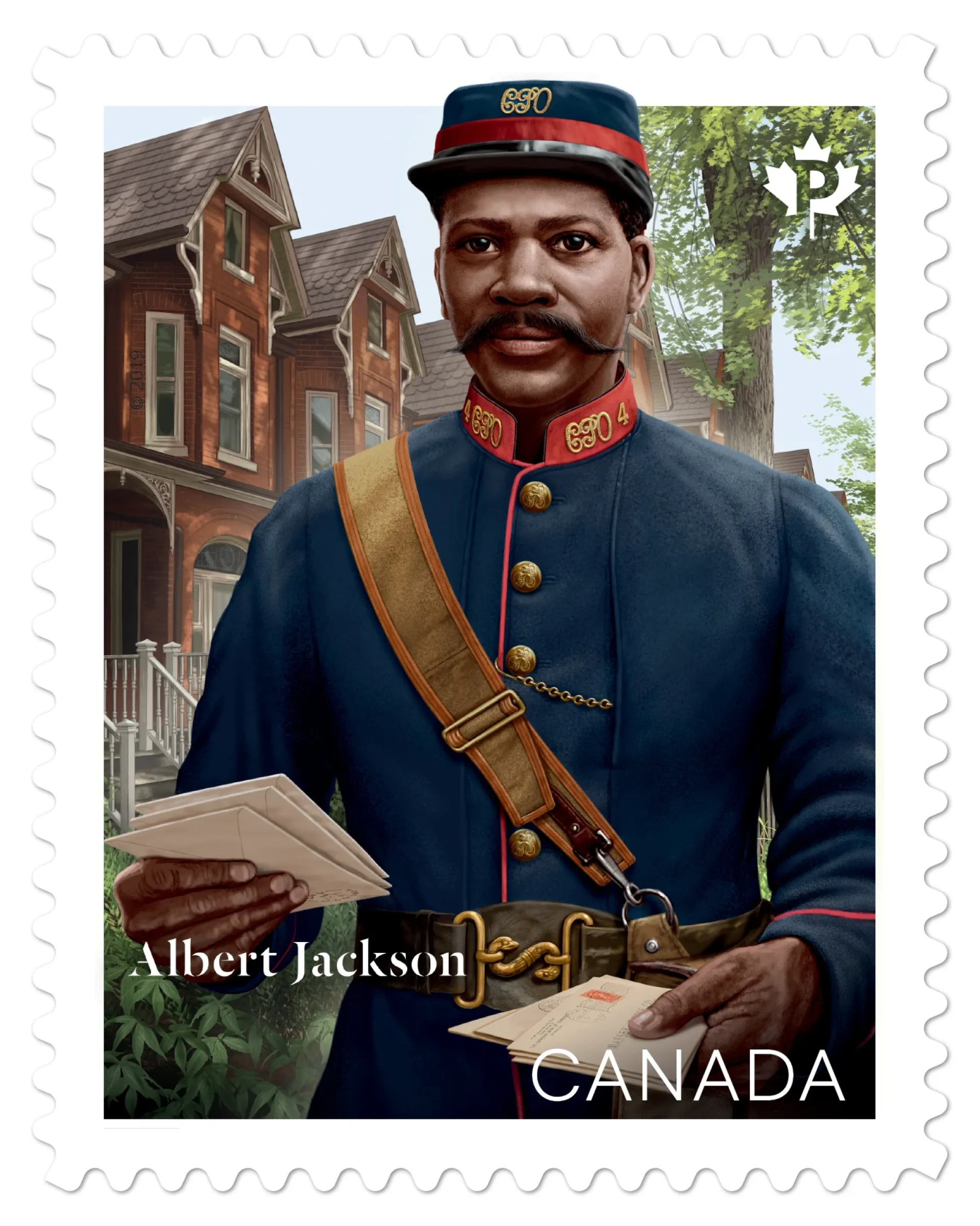 It wasn't until the Jackson's family began their archeological and historical research in 1985 that Albert Jackson began to be recognized and honoured as a pioneer within Toronto's Black community. He began to be memorialized almost three decades later when, in March 2013, the Canadian Union of Postal Workers presented a commemorative poster to Jackson's family. In July of that same year, a laneway behind his former home in Harbord Village was named Albert Jackson Lane. In 2015, "The Postman," an outdoor play, was performed on the actual doorsteps that Jackson delivered mail to. Also, after two years in the making, with family and supporters raising the necessary $6,500 – Heritage Toronto honoured his memory on 21 July 2017 by unveiling a commemorative plaque at the former site of the Toronto General Post Office (1873-1958), where Jackson picked up his deliveries. At the national level, Canada Post unveiled in St. Lawrence Hall, Toronto on 24 January 2019 – in the presence of many descendants of the Jackson family – a commemorative stamp in recognition of being the first Black letter carrier in Canada. Officially issued by Canada Post the following day, the stamp – designed by Andrew Perro and illustrated by Ron Dollekamp – depicts Jackson in his blue mail carrier uniform. Dollekamp said "I wanted to show him performing his duty with a slight smile and a spring in his step, as if he has stepped out of history to hand you your mail."