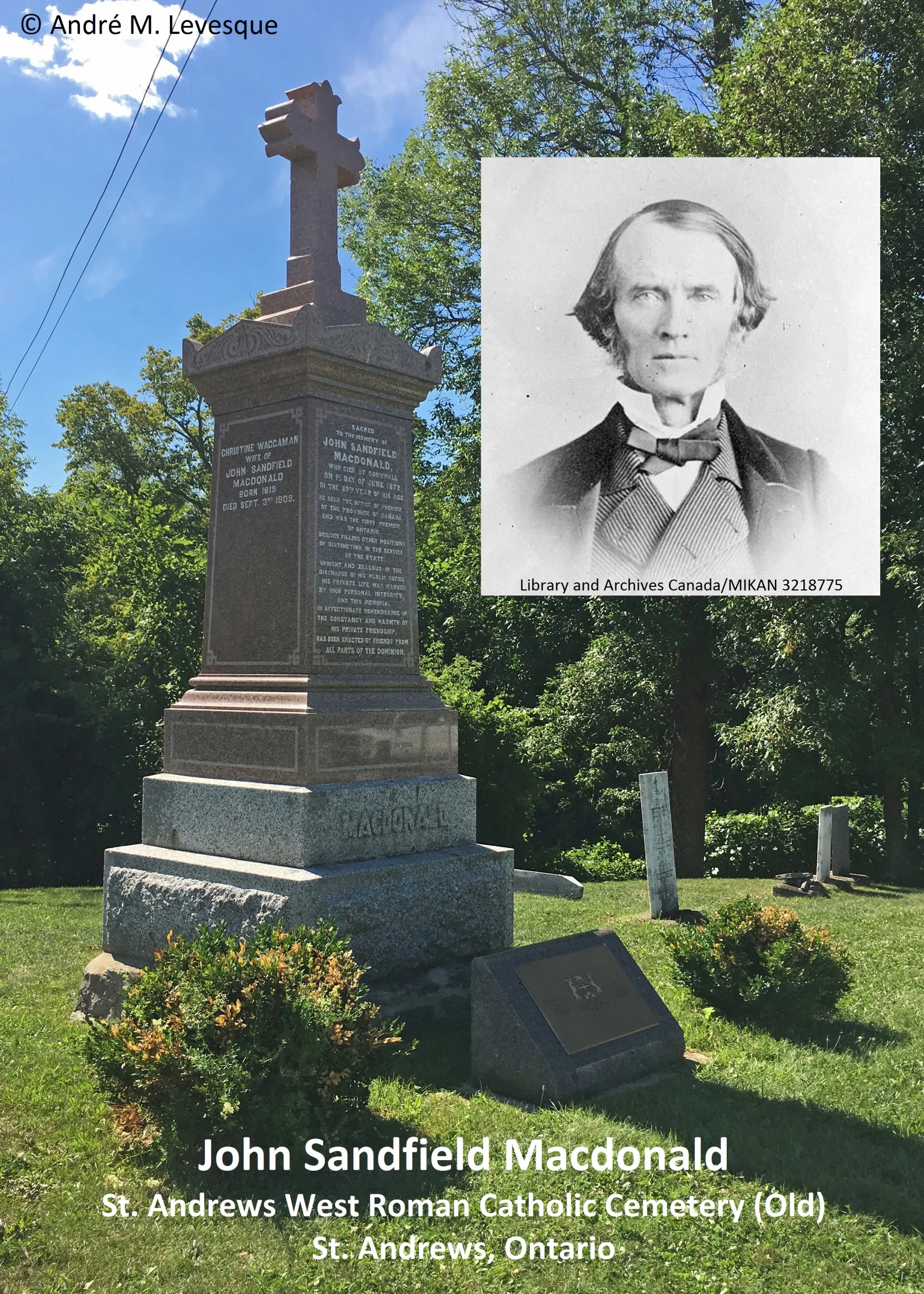 Shown in the photograph, among other pioneer settlers, is the gravesite of John Sandfield Macdonald and his wife Christine Waggaman (1819 – 1909) in the historic St. Andrews West Parish Old Burial Ground, established in 1784. Written on the front of his monument is the following text: "UPRIGHT AND ZEALOUS IN THE DISCHARGE OF HIS PUBLIC DUTIES, HIS PRIVATE LIFE WAS MARKED BY HIGH PERSONAL INTEGRITY, AND THIS MEMORIAL IN AFFECTIONATE REMEMBRANCE OF THE CONSTANCY AND WARMTH OF HIS PRIVATE FRIENDSHIP, HAS BEEN ERECTED BY FRIENDS FROM ALL PARTS OF THE DOMINION." In 2007, the Ontario Heritage Trust marked his grave with a bronze bilingual commemorative plaque with the provincial coat of arms noting his service as Premier of Ontario from 1867 to 1871. The Ontario Archaeological and Historic Sites Board (renamed Ontario Heritage Trust in 2005) had previously erected a large size provincial plaque near his birthplace in St. Raphael, Ontario. A bronze statue of Macdonald, unveiled on 16 November 1909, stands in front of the east side of the Ontario Legislative Building on the grounds of Queen's Park in Toronto. It was sculpted by Walter Seymour Allward (1876 – 1955) who later created the Canadian National Vimy Memorial in France.
